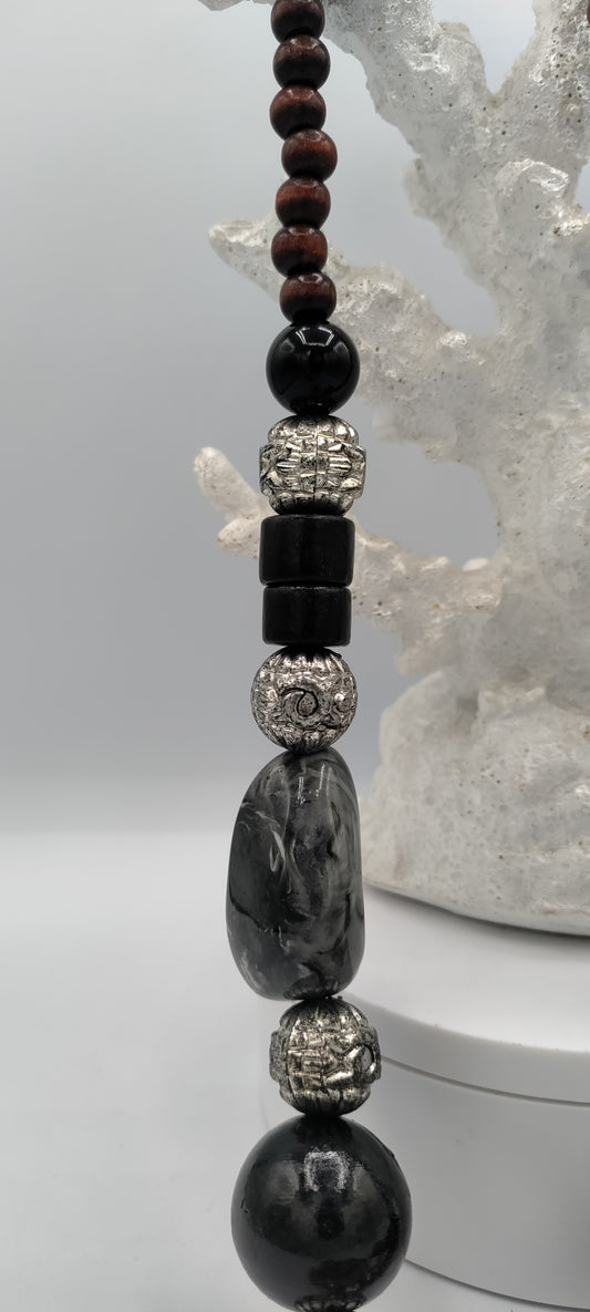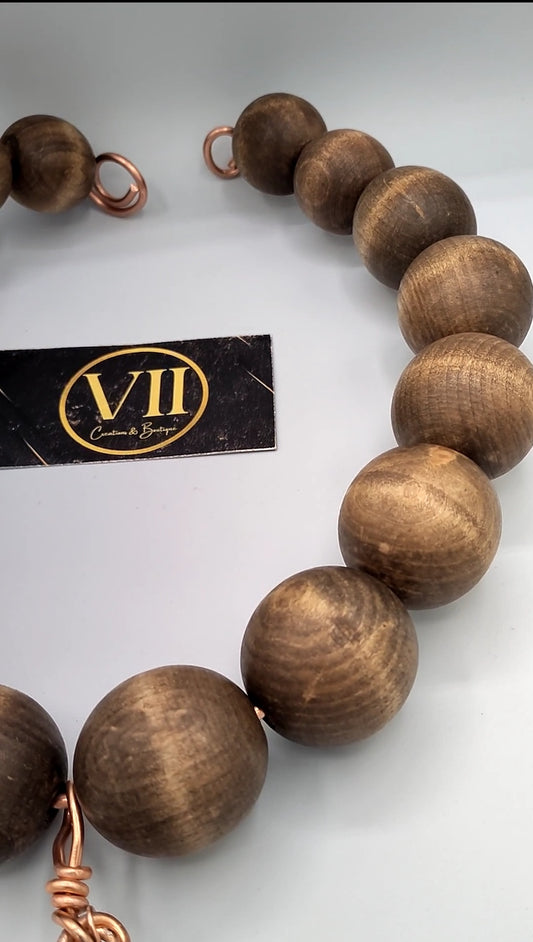 30" Copper Wire & Large Wooden Bead Necklace with Black Obsidian Copper-Wrapped Charm