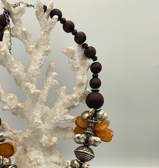 30" Copper Wire & Large Wooden Bead Necklace with Black Obsidian Copper-Wrapped Charm