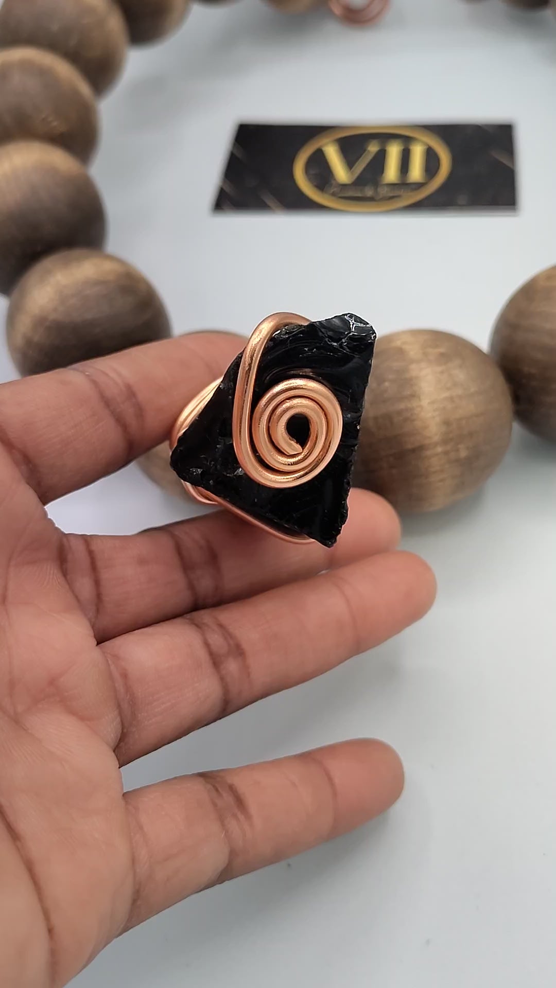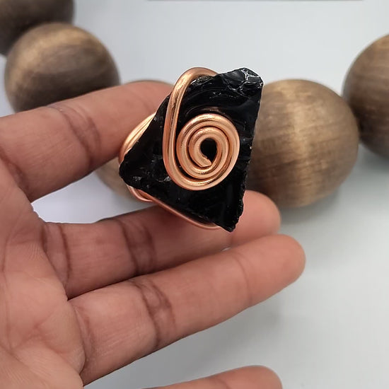 Black obsidian is known as a stone of protection and grounding, helping to absorb negative energy and promote clarity. The rich, earthy tones of the large wood and copper make this piece perfect for everyday wear or as a bold statement accessory.