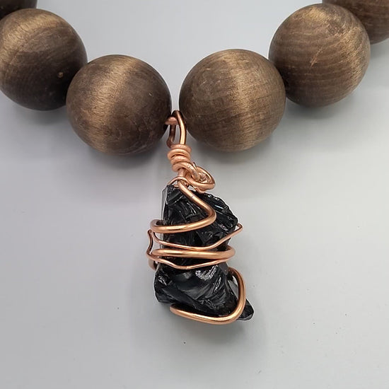 30" Copper Wire & Large Wooden Bead Necklace with Black Obsidian Copper-Wrapped Charm