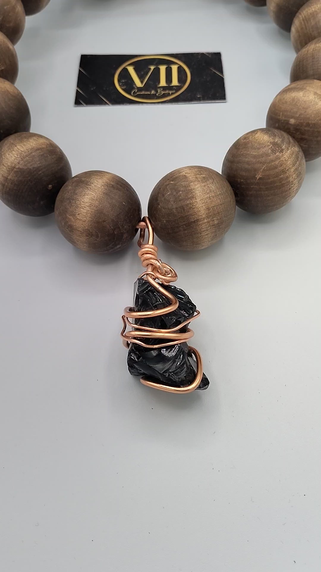 Handcrafted with intention, this 30-inch necklace features smooth wooden beads strung on copper wire. The centerpiece is a polished black obsidian stone, skillfully wrapped in copper to highlight its natural beauty.